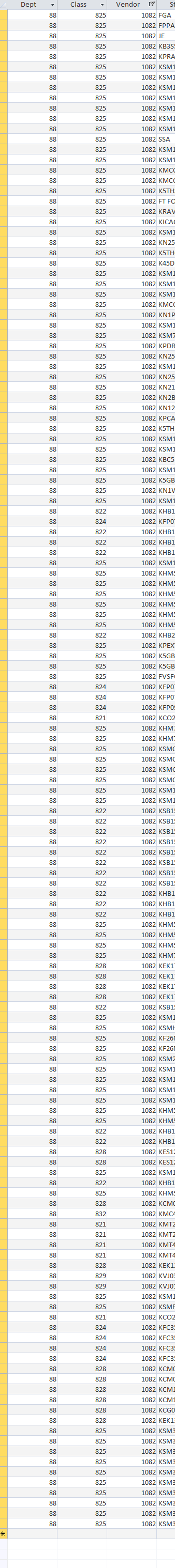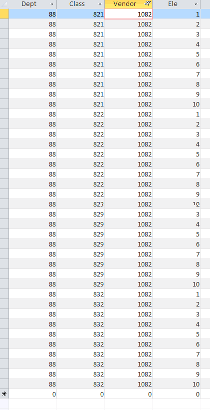 In an Access database, I have a linked table that includes fields Dept, Class, and Vendor, plus other fields. This would be my source table