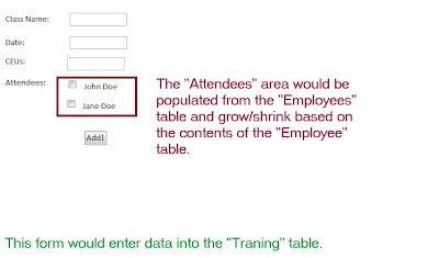 Not so hard, except I want to be able to choose who attended a class by selecting a check-box next to their name. And of course that list will need to be generated from a list of employees in a table every time the form is called - changing based on the the comings and goings of employees.