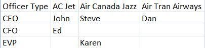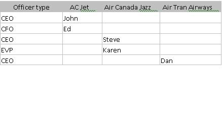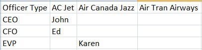 I'm trying to create a simple matrix that lists airlines in columns, officer positions as row header, and the officers in the matrix.